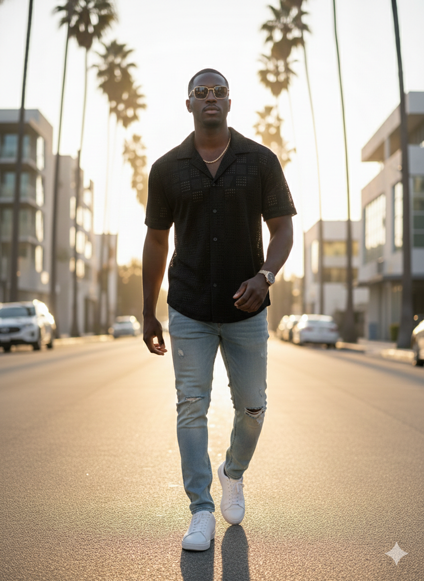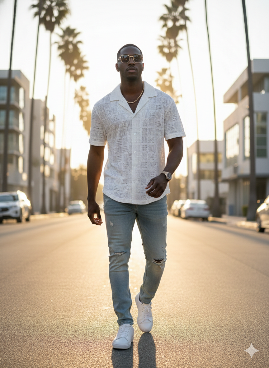 Stay stylish and comfortable with this men’s summer knit button-up shirt. Designed with breathable fabric, short sleeves, and a modern relaxed fit—perfect for casual outings, vacations, or city wear. Pairs easily with jeans or shorts for a clean everyday look.