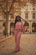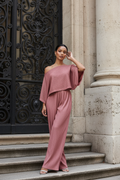 This rose pink two-piece woman set features an elegant off- shoulder top with matching wide- leg pants.Designed for comfort and style,this matching set is perfect for casual outings, brunch,vacations, and everyday wear.